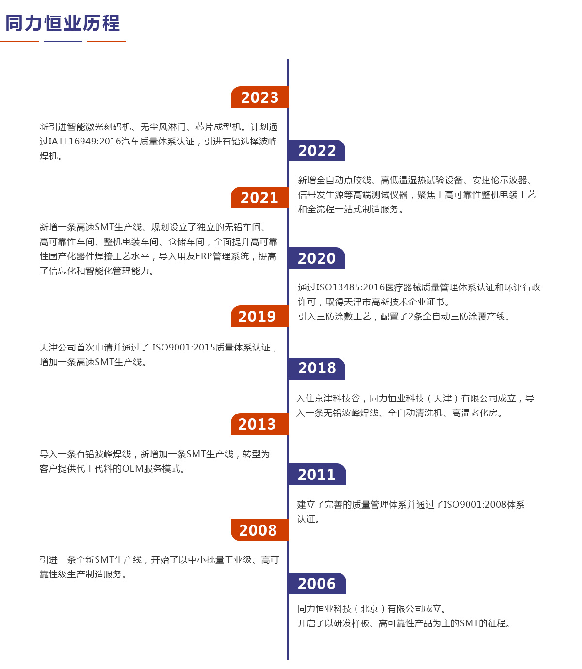 同力恒業科技成立于2006年,專業從事電子制造服務(EMS),專注于為客戶提供產品開發、工藝設計、物料配套、精密貼裝、插件焊接、三防涂敷、整機電裝、測試老化以及包裝運輸、售后維修等整個供應鏈解決方案。公司定位于高可靠性及中高端產品電子制造服務,在通訊導航、儀器儀表、醫療設備、汽車電子等領域具有豐富的一站式制造服務經驗。 工廠地處京津冀協同發展核心區京津科技谷,區位優勢得天獨厚,工廠環境優美,基礎設施齊備。生產及檢測設備配置高、速度快、穩定可靠,通過CRM、ERP、MES系統、專用編制工藝文件軟件與制造環境的融合,實現了對客戶、資源、計劃、制造、執行、經營的數字化、網絡化、智能化管理,滿足快速響應和交付的需求,提升了產品質量、訂單效率、服務水平。 公司嚴抓質量管理,建立了有效的質量管理體系,先后通過質量管理體系(ISO9001)、醫療器械質量管理體系(ISO13485)認證。 自成立以來,公司注重員工的技能培訓,沉淀了一批經驗豐富、專業的技術和管理人才,打造了一支訓練有素的員工隊伍。堅持以人為本,為員工創造良好的工作環境,并致力于推動員工與企業共同成長。同力恒業積極履行環境責任,倡導綠色經營,實現可持續發展。 同力恒業科技努力實現創新、綠色、協調、開放、共贏式發展,為您節約成本、為您簡化生產、為您創造價值。